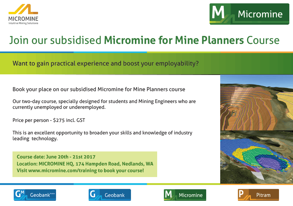 The two day course is designed to give you the knowledge and skills needed to utilise Micromine’s Mine Planning tools. The course has been created and subsidised for students and mining engineers who are presently unemployed and keen to gain some valuable professional development.