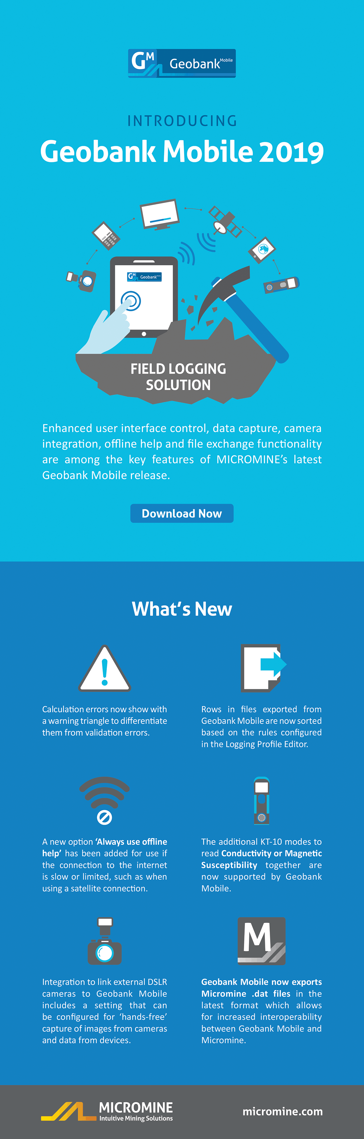 MICROMINE is pleased to announce the release of Geobank Mobile 2019. Enhanced user interface control, data capture, camera integration, offline help and file exchange functionality are among the key features. The leading field logging solution, Geobank Mobile 2019 is available for download now.