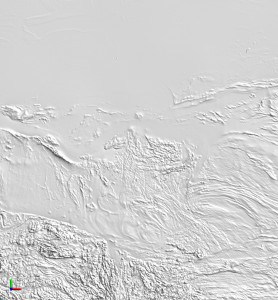 Even without enhancement, you can easily see areas of high geophysical relief at the bottom of the image. Not so obvious are the areas of low relief near the top.