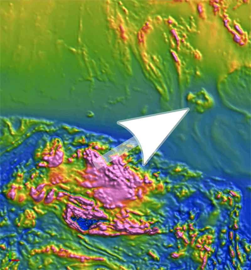 First, a greyscale comparison in a region with low relief. The left-hand image uses Micromine’s Greyscale – Gamma 05 palette, the right uses the CET linear_grey_0_100_c0_n256 palette. Note how the region immediately above the arrowhead appears almost featureless in the left image, but if you look carefully at the right image, you’ll discover a network of tiny channels wrapping around the arrowhead (they are much easier to see in the full-resolution images). The difference is subtle, but could easily make the difference between seeing or missing important palaeochannels.