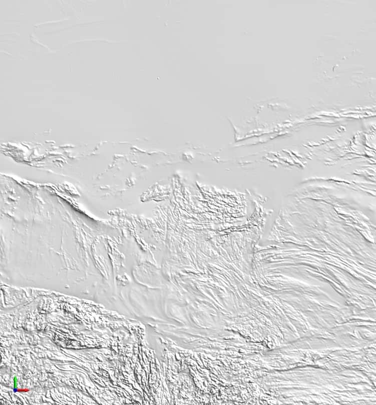 So, what does this mean in the real world? Here’s a geophysical (aeromagnetic) image, displayed in 3D Shaded mode with default lighting and no other enhancements: