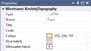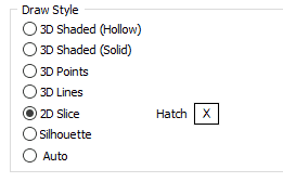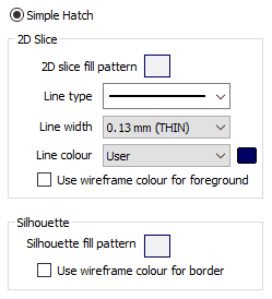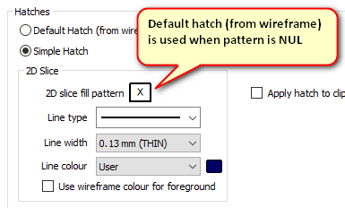 - Default: 2D Slice and Silhouette hatch patterns can be saved to the wireframe itself and these values will be used when the default option is chosen. The initial settings for 2D Slice and Silhouette will be no fill with a border line width of 0.35mm, drawn using the wireframe colour. The 2D Slice line type is solid while the Silhouette is dashed.