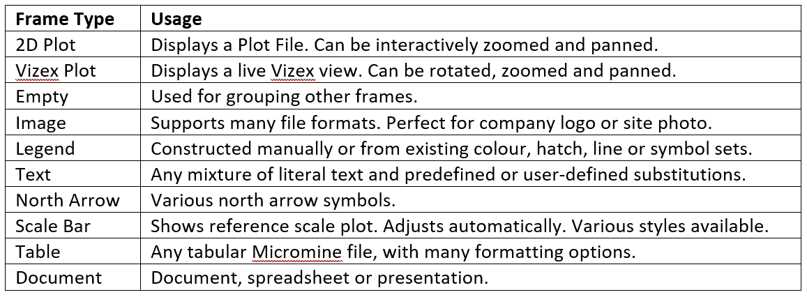 Modifications to a plot layout can be as broad as applying a completely new template, or as subtle as changing the properties of a single plot frame. Micromine includes a variety of pre-defined layout templates and plot forms (predefined frame properties) to speed up both processes.