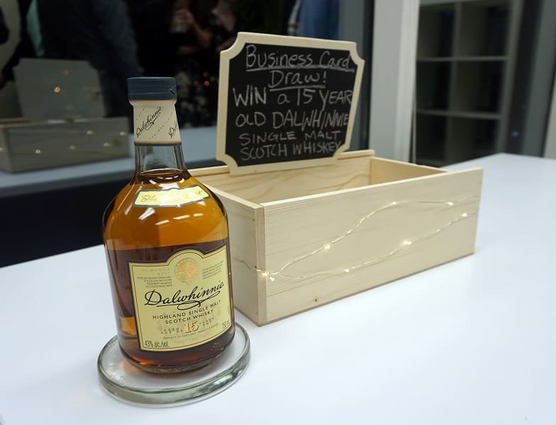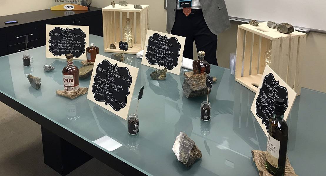 Four scotch/whiskies were chosen from different countries, each representing a geographic direction; North was Canadian Crown Royal XO, East was Scotland’s Singleton of Dufftown, South was American 10-year old Russell’s Reserve, West was Japan’s Nikka from the Barrel. A bottle of Dalwhinnie 15-year old scotch was given to the winner of the business card draw. The office was decorated with a variety of rocks and mineral samples collected from all around Canada, provided by co-sponsor Casa Minerals.